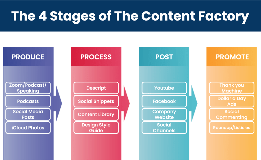 The 4 stage Content Factory is our process for amplifying content to rank higher on search engines and promote what’s already working best through ads for your local service business. The credit for this process goes to Dennis Yu and his original post of here.